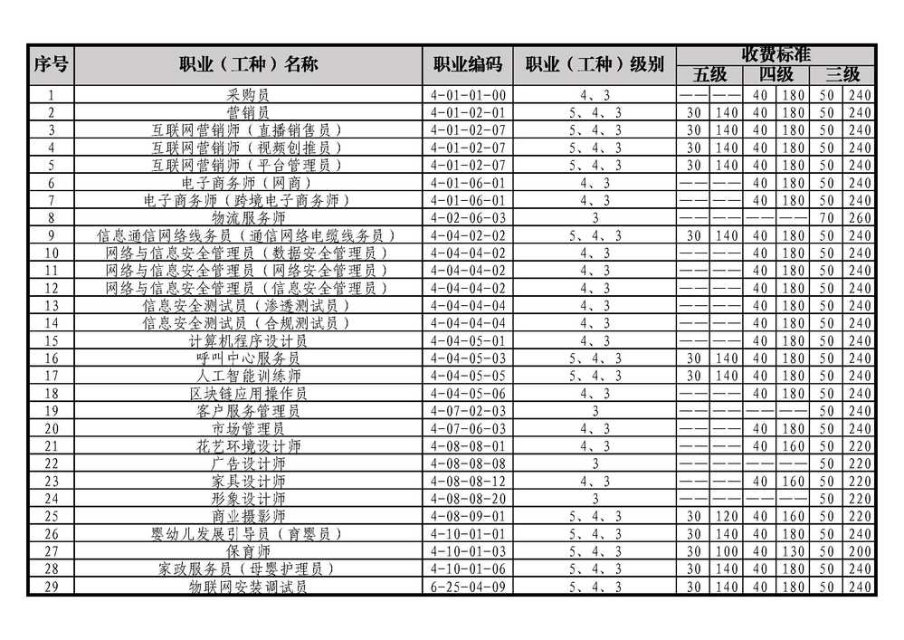 三、认定职业(工种)等级及收费标准